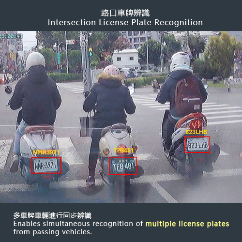 搭配科技執法應用,可運用高解析攝影機,同時完成寬車道範圍內車輛偵測與車牌辨識應用。
