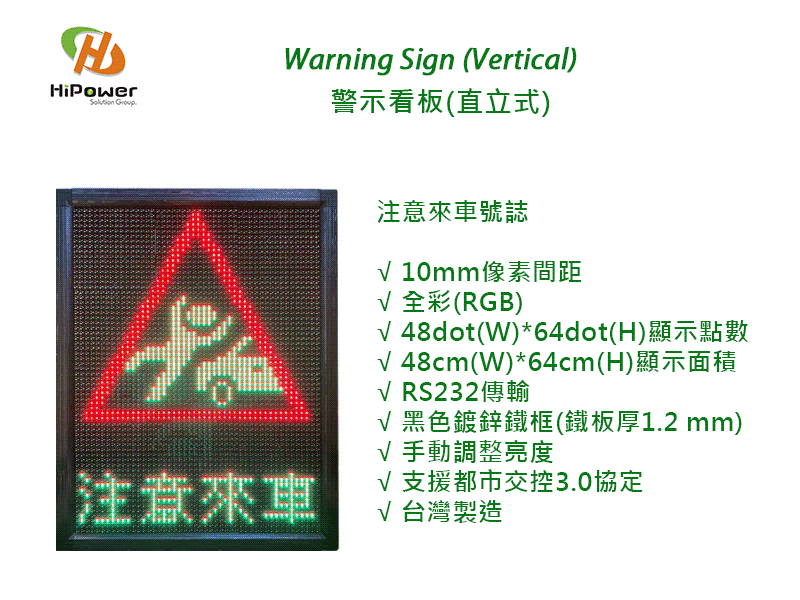 | 10mm | 全彩(RGB) | 48dot(W)*64dot(H) | 48cm(W)*64cm(H) | RS232 | 黑色鍍鋅鐵框(鐵板厚1.2 mm) | 手動調整 | 支援都市交控3.0協定 | 台灣製造 |