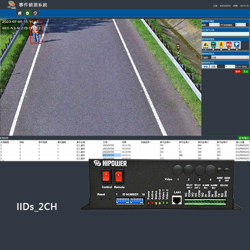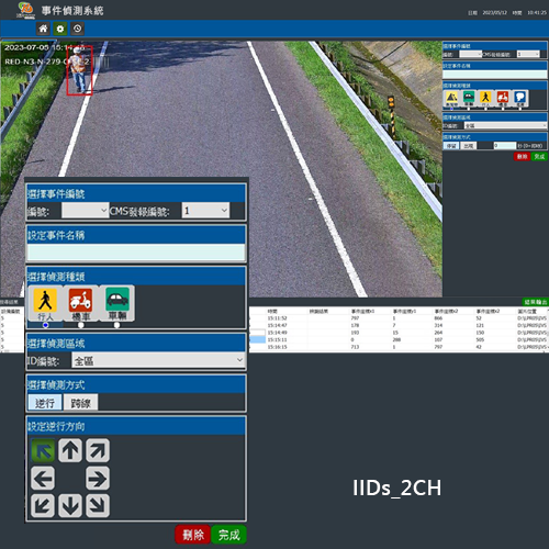 回報事件類別、發生時間、發生車道、發生車種、發生攝影機編號。回報即時事件影像畫面(畫面上會標示出事件位置)。