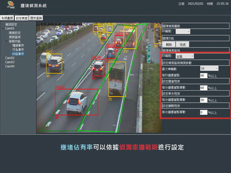 偵測區內之壅塞率(%)。偵測區內之車輛停等偵測。