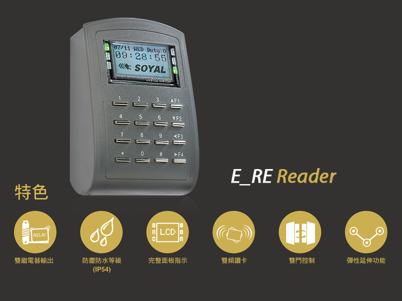 〉內建看門狗防當機、萬年曆、防破壞開關、防塵防水功能、鬧鈴設定、假日設定、進出管制時段、自動開門時段、一進一出功能、門位〉監視輸入、提供開門逾時警報與強行進入警報功能