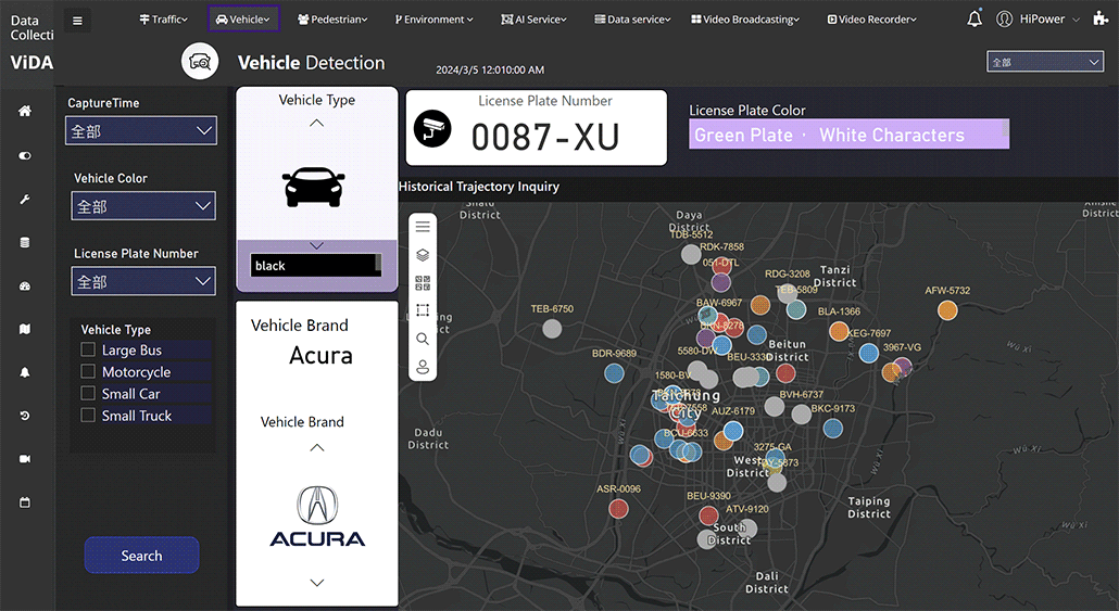 在 ViDA.ai 平台的車輛歷史查詢介面中,可依車種、車牌、品牌與車色等多元特徵進行查詢,並呈現行經時間、地點與清晰影像,支援交通追蹤與稽查應用。