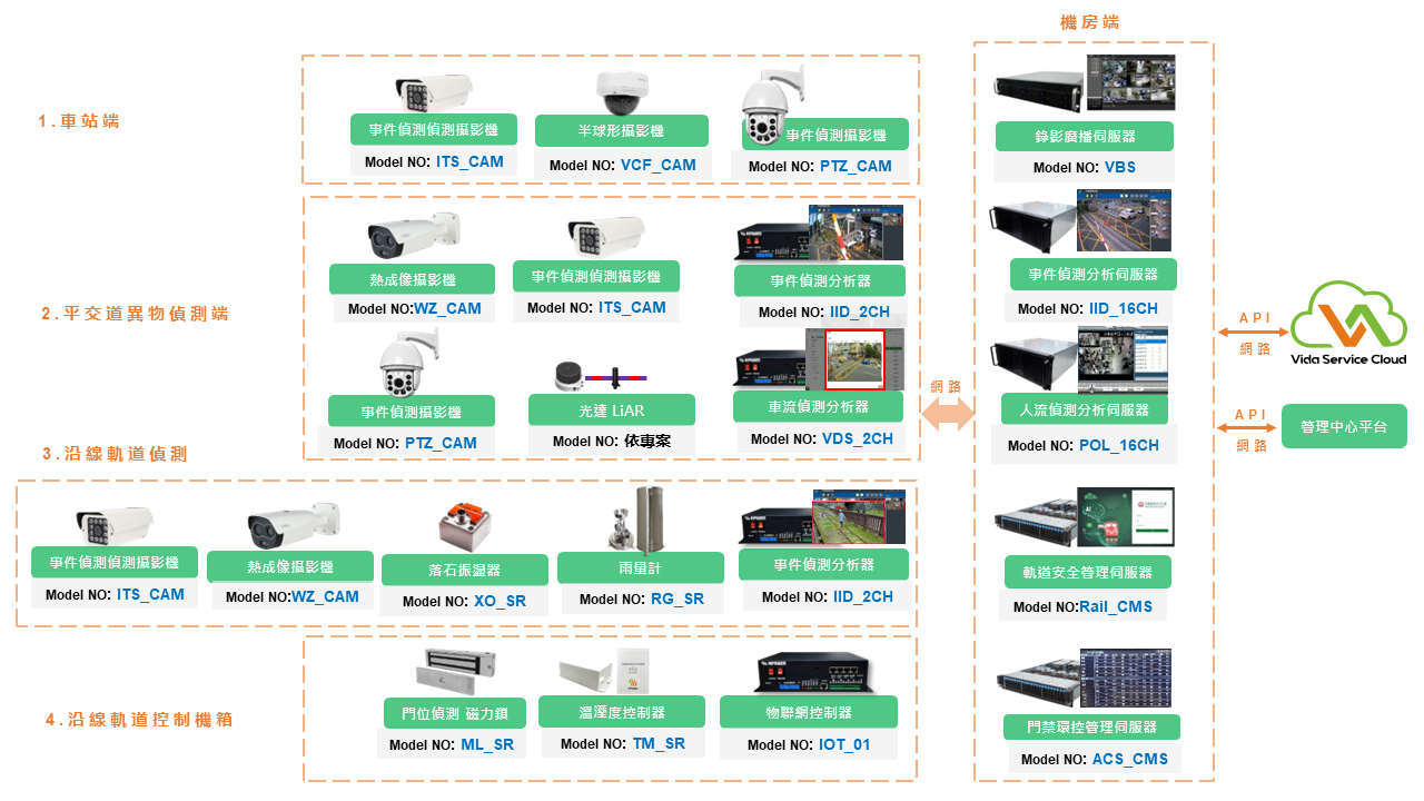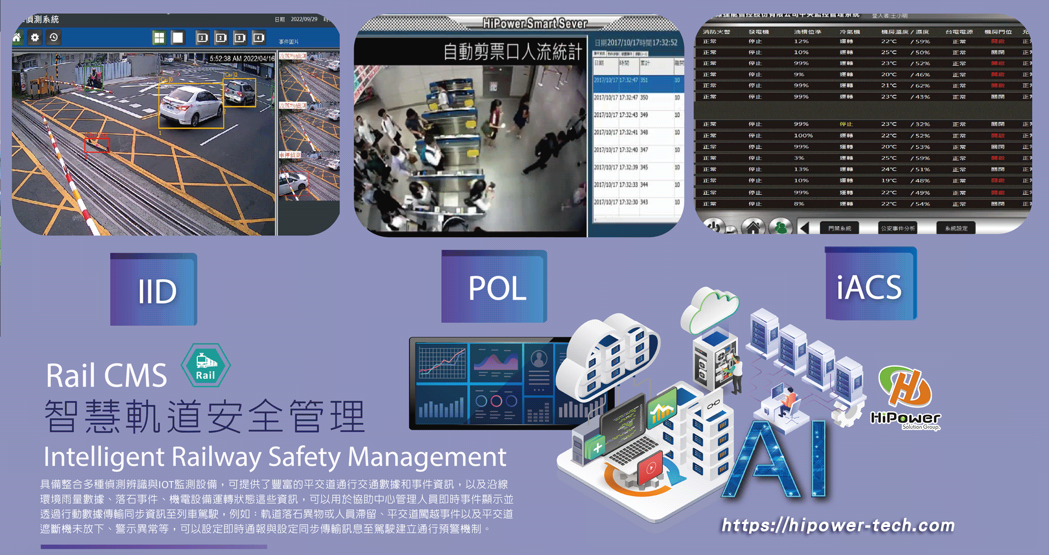 軌道安全管理系統主要在於解決沿線行車軌道安全問題,並針對軌道環境場域(車站、平交道、沿線軌道、邊坡落石區)進行即時監測統計與偵測觸發通報管理,管理目的在於建立預警通報與避免事故產生損害的目標。透過智慧化AIOT辨識監測系統,偵測統計車站人流、偵測追蹤平交道行人、偵測辨識通行車輛與交通流量、平交道異物偵測與啟動警報器、沿線軌道人員滯留與散落物偵測、邊坡落石監測搭配雨量計偵測、箱體環控監測、平交道設備運作狀態監測與控制,透過光纖網路或是NBIOT或是行動通訊將監測數據與影像資訊傳輸至管理系統平台進行建立整合管理,同時提供中心管理人員即時判讀和異常時遠端控制管理。