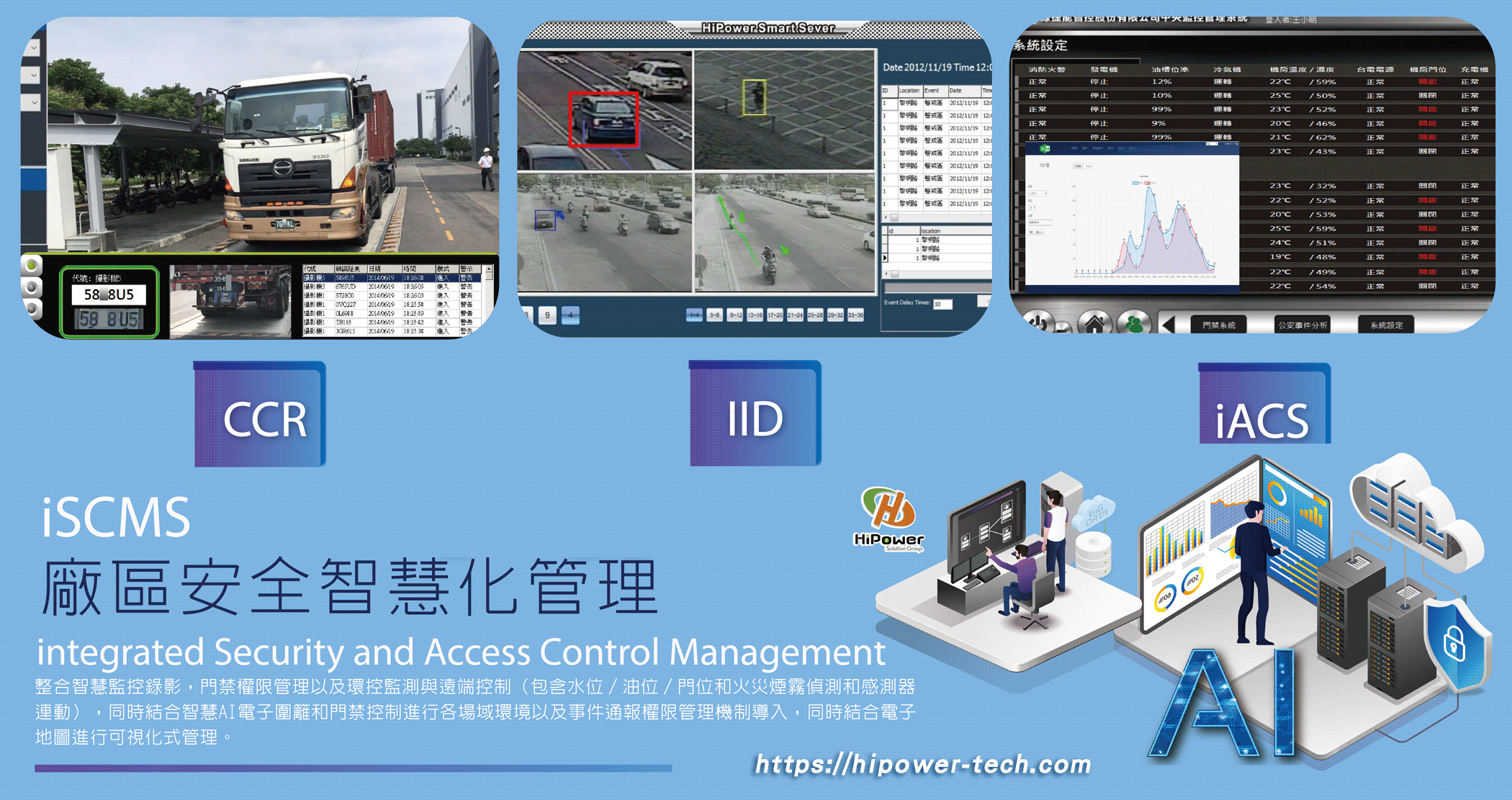 iSCMS廠區安全智慧化管理系統是一套採用系統模組化設計,具備整合智慧監控錄影,門禁權限管理以及環控監測與遠端控制(包含水位/油位/門位和火災煙霧偵測和感測器連動),同時結合智慧AI電子圍籬和門禁控制進行各場域環境以及事件通報權限管理機制導入,同時結合電子地圖進行可視化式管理,本系統目前也同時具備依據各產業應用環境的實際管理需求協助業主進行特定功能客製化服務。