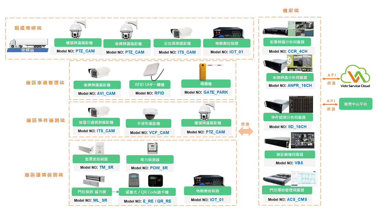 採用AI影像偵測辨識廠區作業環境以及車輛進出辨識比對,並透過資料比對以及整合週邊設備進行邏輯判讀與建立連動管理機制。